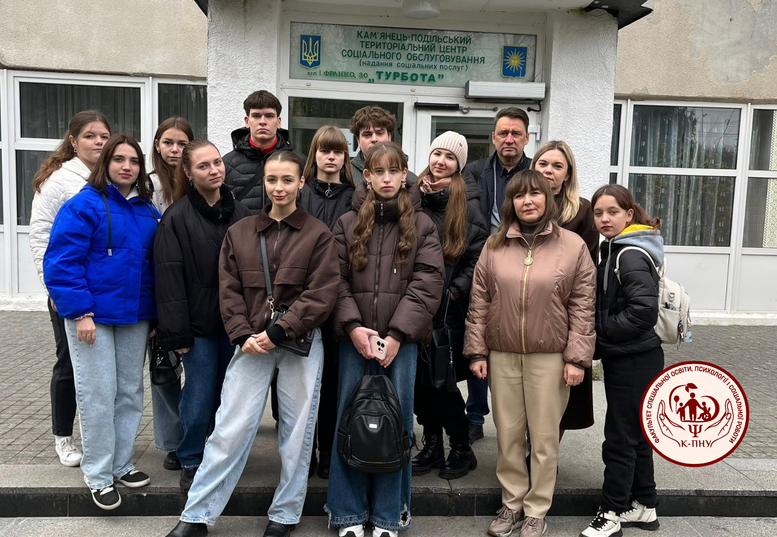 7 листопада 2025 року відбулася ознайомча екскурсія здобувачів першого (бакалаврського) рівня вищої освіти освітньо-професійних програм «Соціальна робота та соціально-психологічне консультування (Srk1-B25), «Соціально-психологічна реабілітація» (Sr1-B24) та «Соціальна допомога» (Sz1-B24) до Кам’янець-Подільського територіального центру соціального обслуговування (надання соціальних послуг) «Турбота». Знайомство з діяльністю центру провела Пермякова Лілія Миколаївна, завідувачка відділення денного перебування, яка ознайомила здобувачів вищої освіти