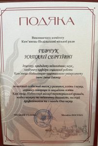 Колектив кафедри соціальної роботи вітає завідувача кафедри соціальної роботи, кандидата педагогічних наук, доцента – Наталію Гевчук з отриманням Подяки виконавчого комітету Камʼянець-Подільської міської ради за вагомий особистий внесок у розвиток освіти і науки, активну співпрацю із закладами освіти Камʼянець-Подільськоі міської територіальної громади, плідну наукову та педагогічну діяльність, високий професіоналізм та з нагоди Дня науки!