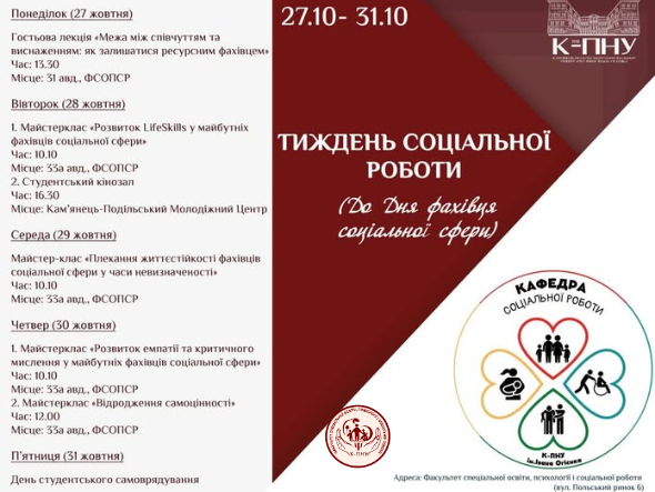 Колеги, студенти, друзі, кафедра соціальної роботи запрошує на заходи Тижня соціальної роботи, присвячені Дню фахівця соціальної сфери
