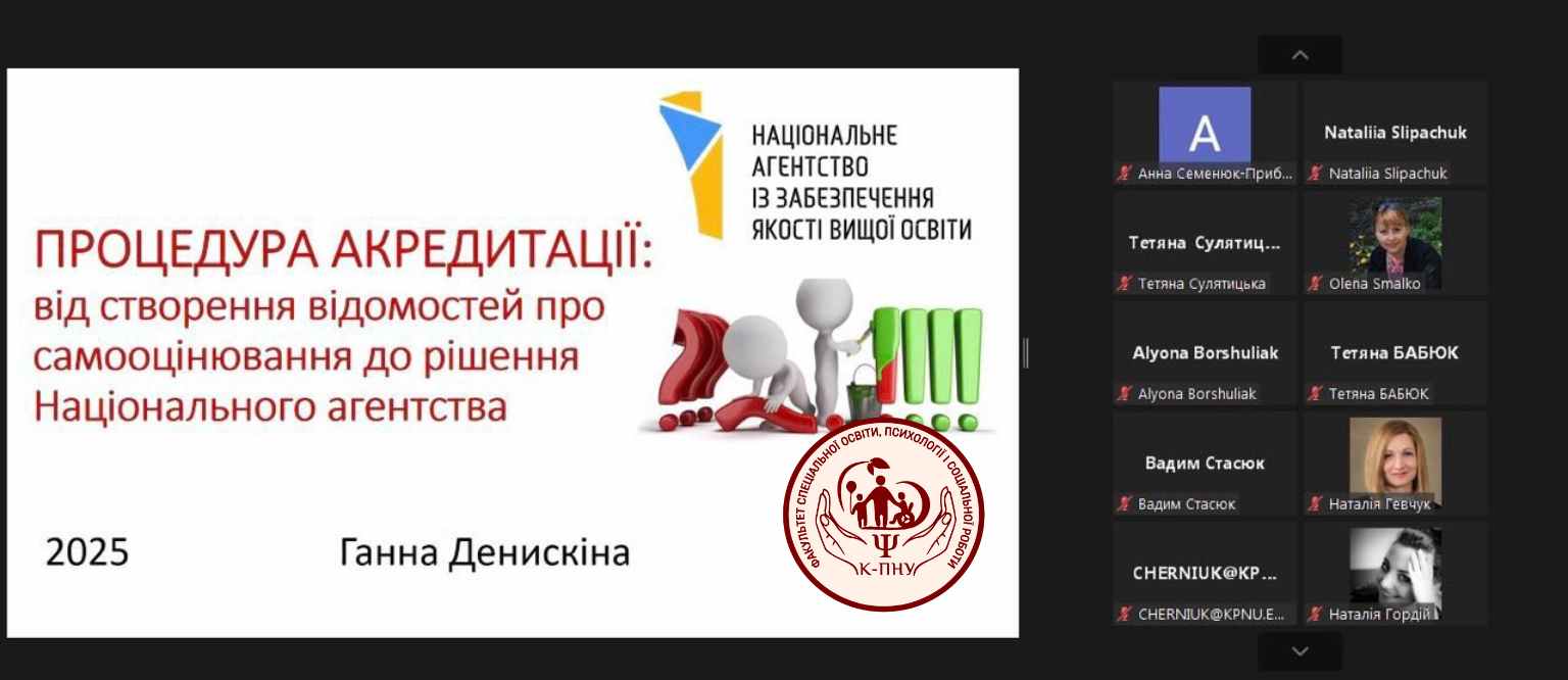 28 жовтня 2025 року гаранти освітніх програм Гевчук Н.С. (ОПП Соціальна допомога першого (бакалаврського) рівня вищої освіти), Мельник Ж.В. (ОПП Соціаоьна робота та соціально-психологічне консультування першого (бакалаврського) рівня вищої освіти), Мельник Л.П. (ОПП Соціальна допомога другого (магістерського) рівня вищої освіти) були учасниками семінару «Процедура акредитації: від створено відомостей про самооцінювання до рішення Національного агентства». Спікер – Ганна Денискіна.