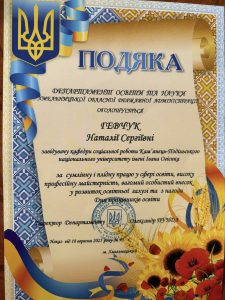 Вітаємо завідувача кафедри соціальної роботи Наталію Гевчук із отриманням подяки від Департаменту освіти і науки Хмельницької обласної державної адміністрації.