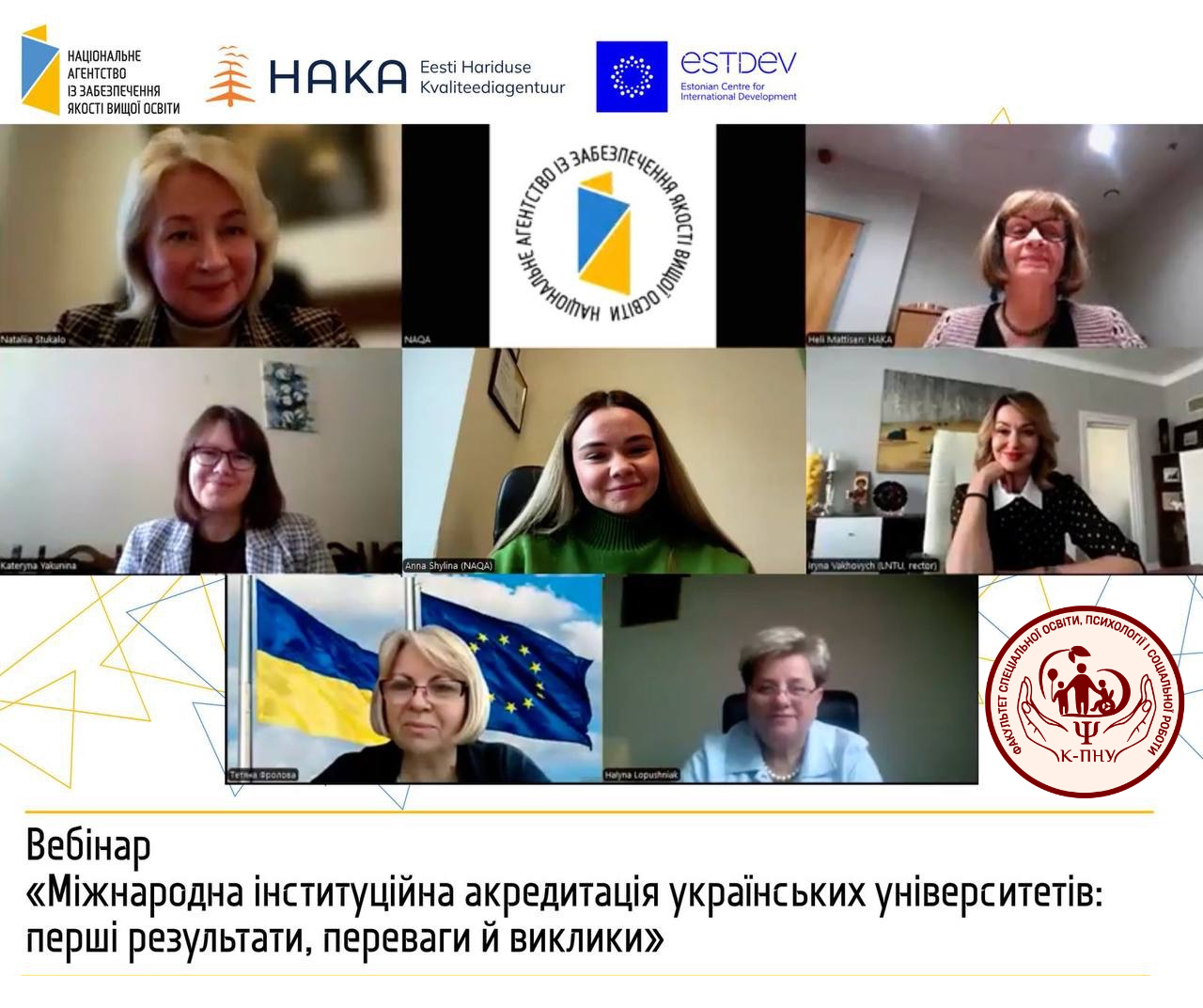 19 лютого 2026 року Мельник Ж.В., гарант освітньо-професійної програми «Соціальна робота та соціально-психологічне консультування» першого (бакалаврського) рівня вищої освіти прослухала вебінар: «Міжнародна інституційна акредитація українських університетів: перші результати, переваги й виклики», організований у межах спільного проєкту Національного агентства із забезпечення якості вищої освіти та Естонського агентства якості освіти (HAKA) за підтримки ESTDEV.