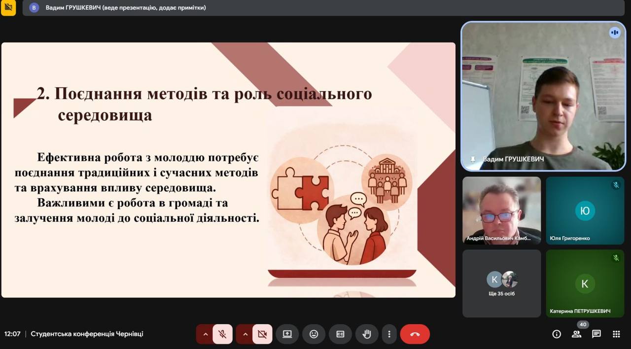 27 березня 2026 року здобувачі вищої освіти спеціальностей 231 «Соціальна робота» та 232 «Соціальна допомога» взяли активну участь у Всеукраїнській студентській науково-практичній конференції «СОЦІАЛЬНА РОБОТА В УМОВАХ СУСПІЛЬНИХ ТРАНСФОРМАЦІЙ: СОЛІДАРНІСТЬ, ВІДНОВЛЕННЯ І ГАРМОНІЗАЦІЯ РОЗВИТКУ», що відбулася на базі Чернівецького національного університету імені Юрія Федьковича (факультет педагогіки, психології та соціальної роботи, кафедри педагогіки та соціальної роботи).