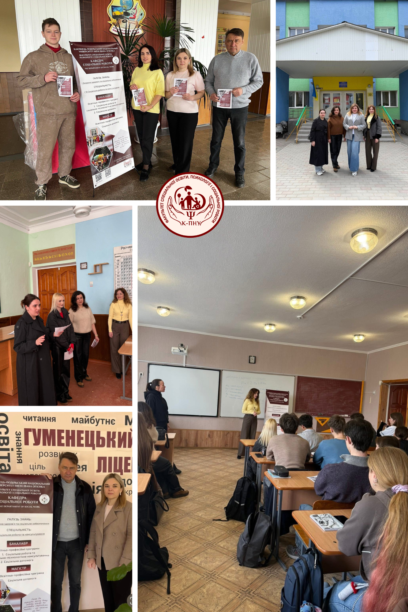 22 квітня 2026 року у ліцеях міста Дунаївці відбулися профорієнтаційні заходи. Декан Тетяна Опалюк факультету спеціальноі освіти, психологіі і соціальноі роботи ознайомила майбутніх абітурієнтів зі спеціальностями, які можна здобути, навчаючись на факультеті. Спеціальність I10 Соціальна робота та консультування презентували завідувач кафедри соціальної роботи Наталія Гевчук, доцент Олена Данилюк та студенти кафедри соціальної роботи КПНУ імені Івана Огієнка.