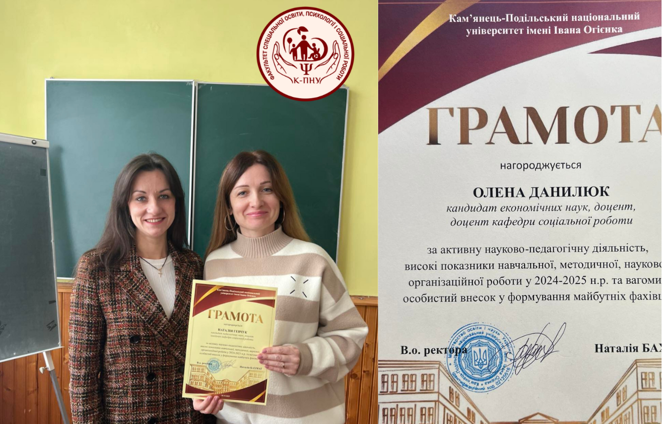 Завідувачка кафедри соціальної роботи Наталія ГЕВЧУК та доцент кафедри соціальної роботи Олена ДАНИЛЮК нагороджені Грамотою за активну науково-педагогічну діяльність, високі показники навчальної, методичної та науково-організаційної роботи у 2024-2025 н.р.. Щиро вітаємо колег із заслуженою нагородою! Нових здобутків, нових перемог!